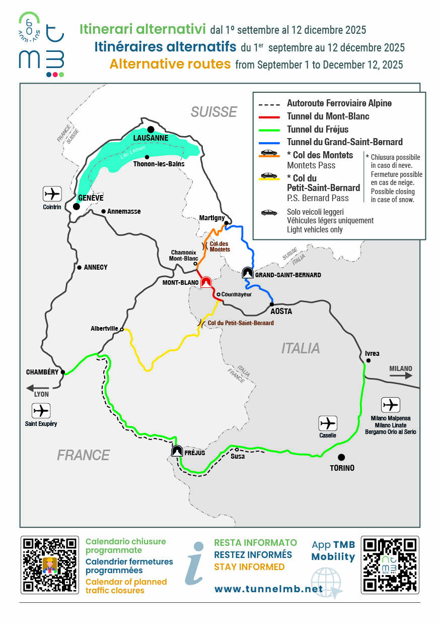 - Tunelul Fréjus – leagă Modane (Franța) de Bardonecchia (Italia) și este principala rută alternativă pentru vehicule grele de marfă. Taxa poate fi achitată cu cardul Frejus sau cardul SD DKV.